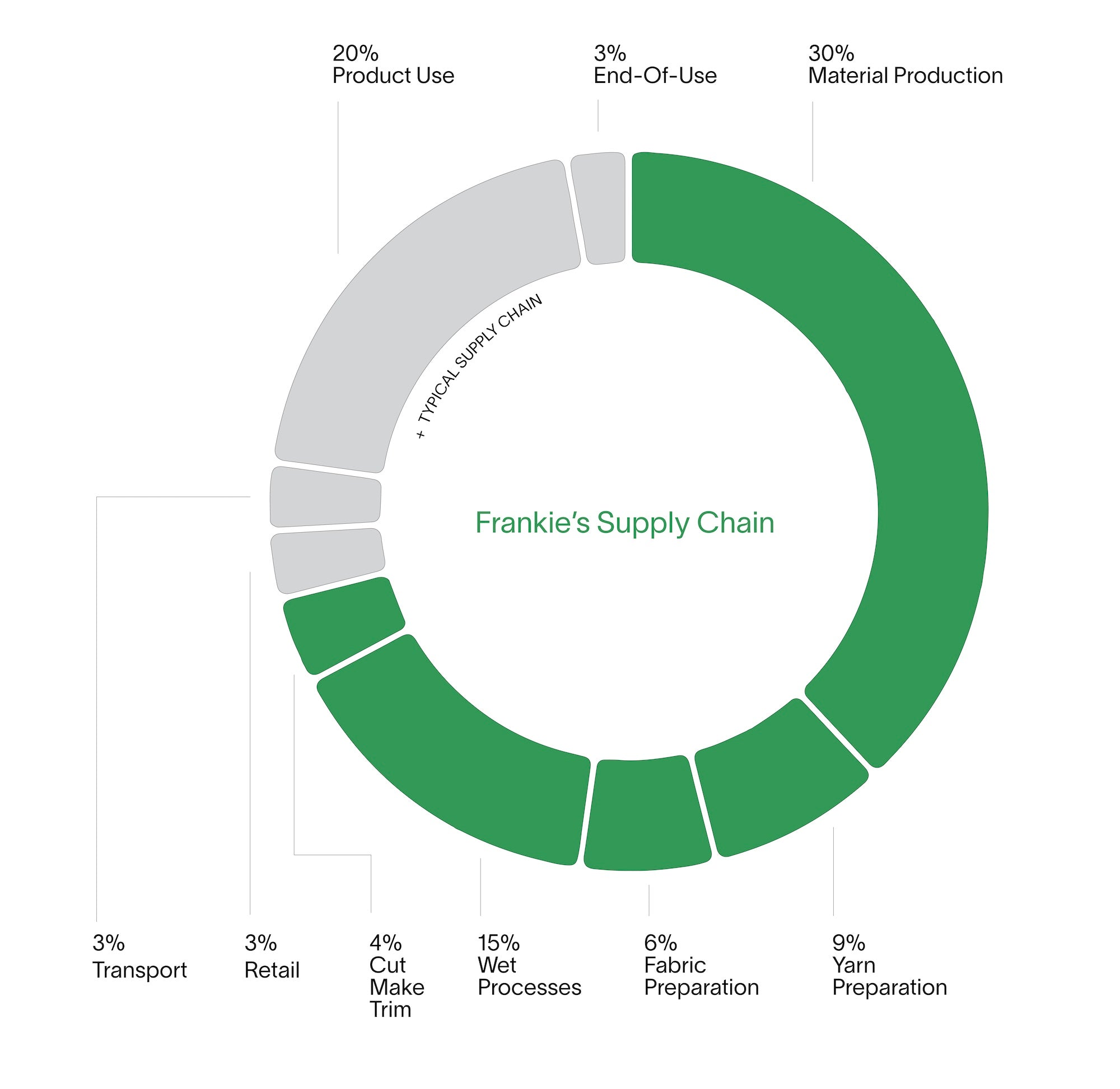 This chart highlights where most of fashion’s environmental impact occurs—over 60% of emissions come from upstream production like material creation, wet processes, and fabric prep. These early stages are the most resource- and pollution-heavy. At Frankie, we bypass them entirely by reworking existing garments, proving that circular design isn’t just better—it’s the future.