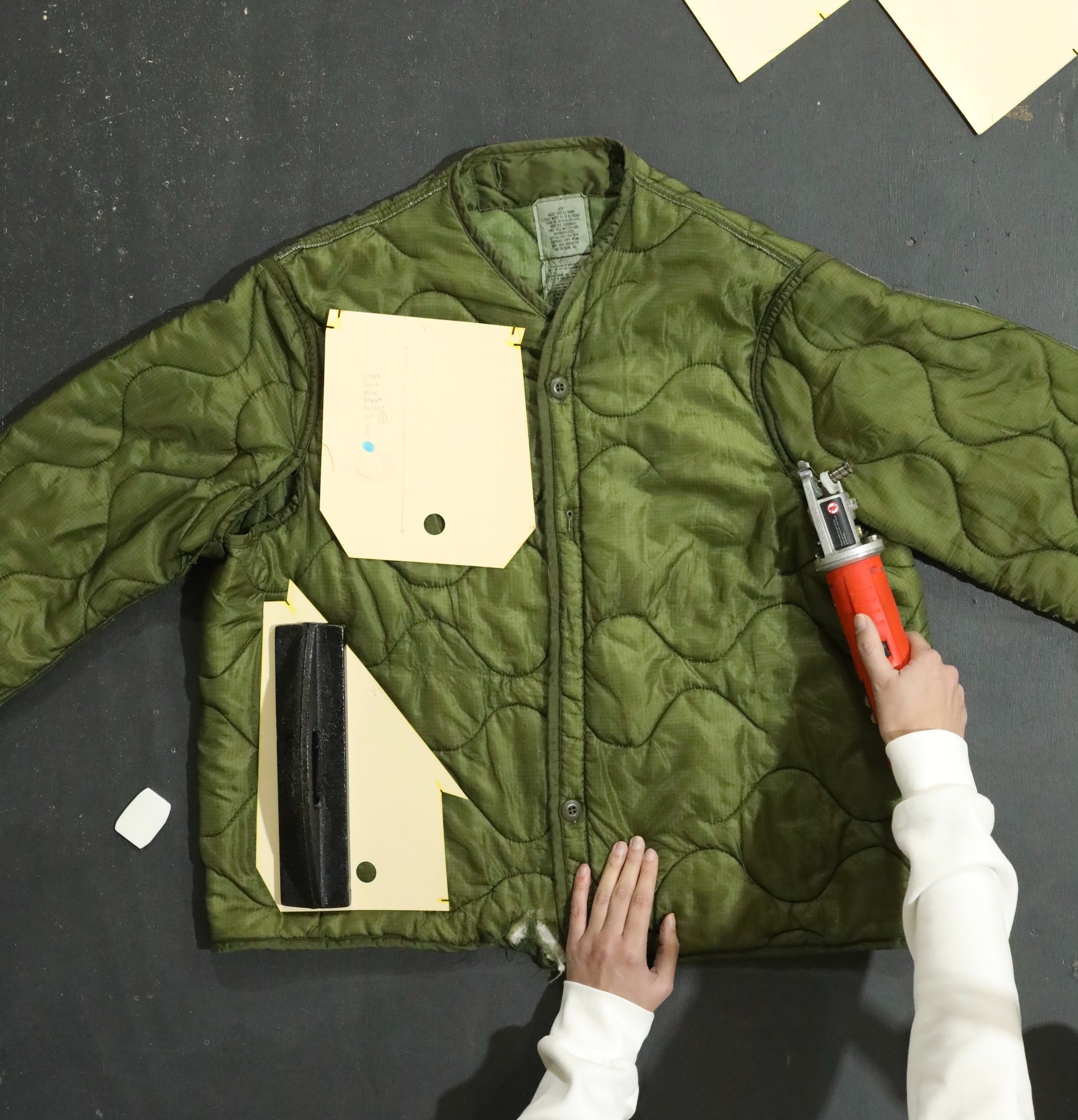 Every rework is made in-house by our team. We source vintage, cut and sew each piece by hand, and rebuild it from the ground up. No two pieces are the same — and nothing goes to waste.